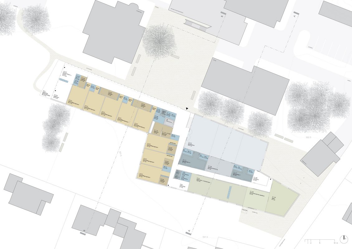 The new building takes a complementary position and frames together with the existing buildings a new square. As a meeting point, the square forms the new spatial identity and is turntable of communication for its residents.